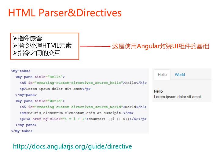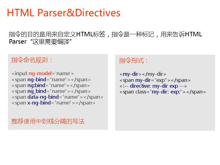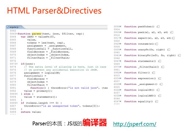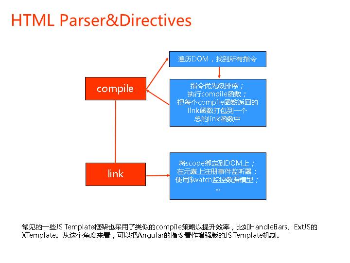 常见的一些JS Template框架也采用了类似的compile策略以提升效率,比如HandleBars、ExtJS的XTemplate。从这个角度来看,可以把Angular的指令看作增强版的JS Template机制。
