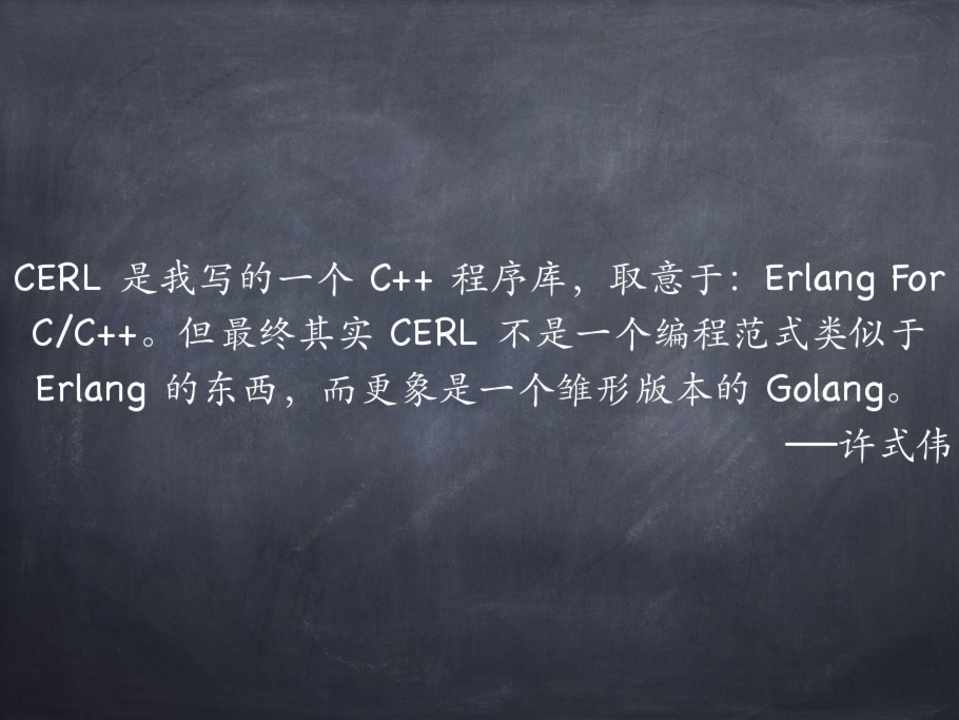 CERL 是我写的⼀一个 C++ 程序库,取意于:Erlang For C/C++。但最终其实 CERL 不是⼀一个编程范式类似于 Erlang 的东西,⽽而更象是⼀一个雏形版本的 Golang。