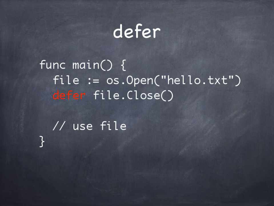 func main() { file := os.Open("hello.txt") defer file.Close()