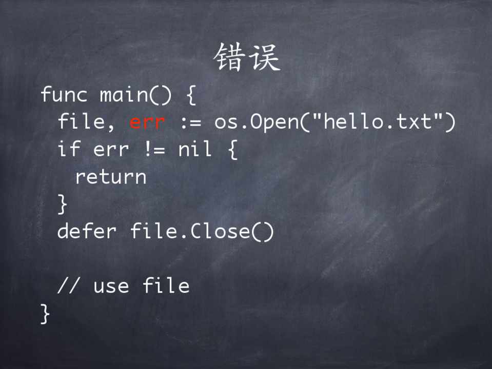 func main() { file, err := os.Open("hello.txt") if err != nil { return } defer file.Close()