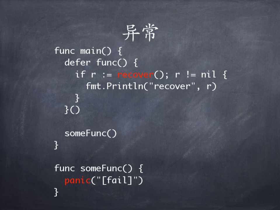 func main() { defer func() { if r := recover(); r != nil { fmt.Println("recover", r) } }()