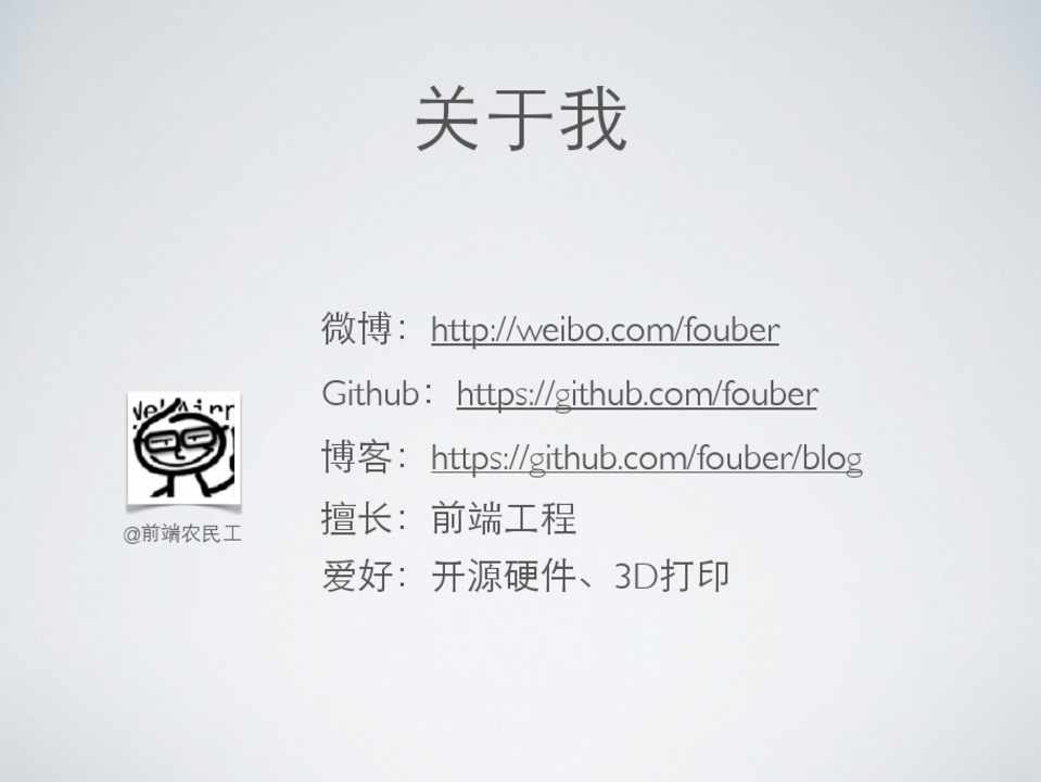 微博:http://weibo.com/fouber Github:https://github.com/fouber 博客:https://github.com/fouber/blog 擅⻓长:前端⼯工程 爱好:开源硬件、3D打印