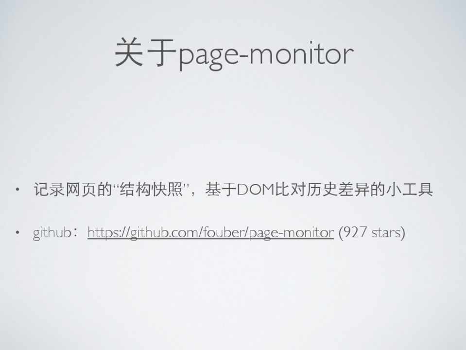 • 记录⺴⽹网⻚页的“结构快照”,基于DOM⽐比对历史差异的⼩小⼯工具 • github:https://github.com/fouber/page-monitor (927 stars)