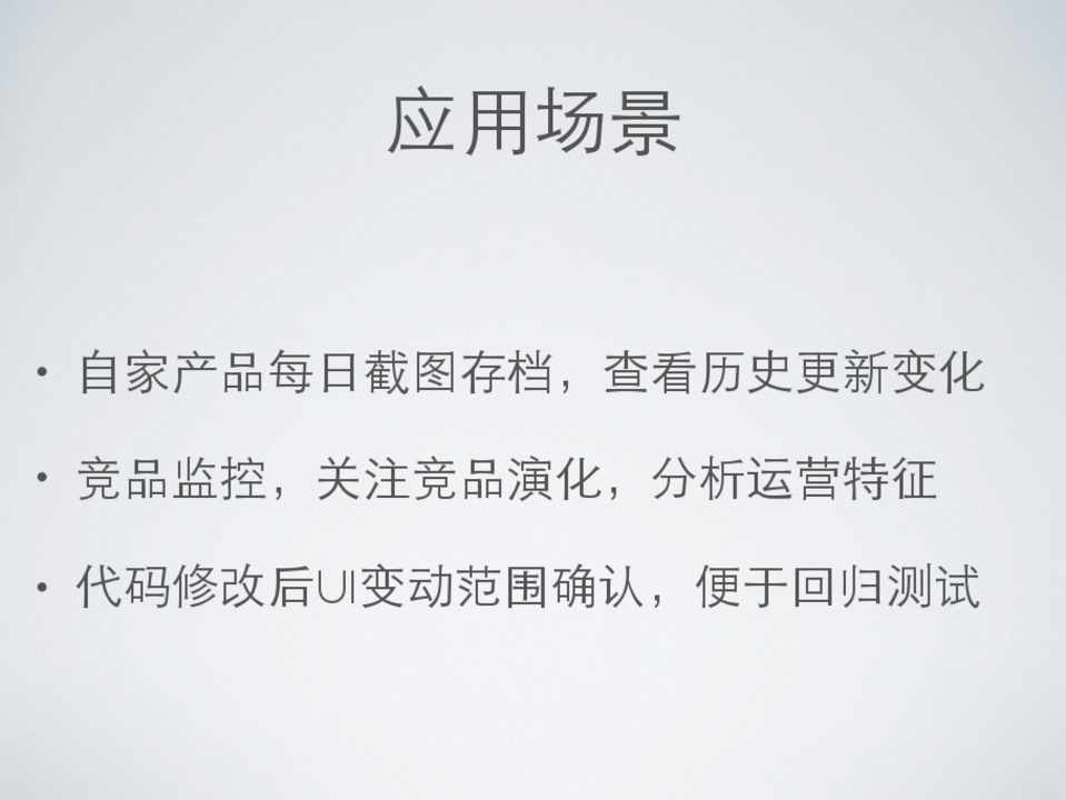 • ⾃自家产品每⽇日截图存档,查看历史更新变化 • 竞品监控,关注竞品演化,分析运营特征 • 代码修改后UI变动范围确认,便于回归测试