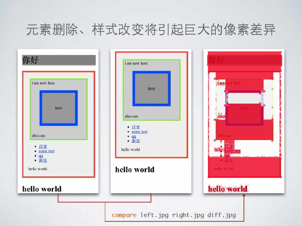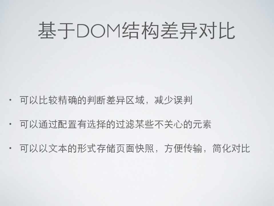 • 可以⽐比较精确的判断差异区域,减少误判 • 可以通过配置有选择的过滤某些不关⼼心的元素 • 可以以⽂文本的形式存储⻚页⾯面快照,⽅方便传输,简化对⽐比