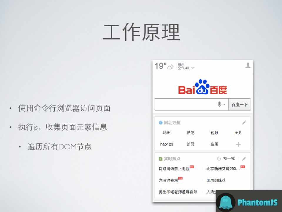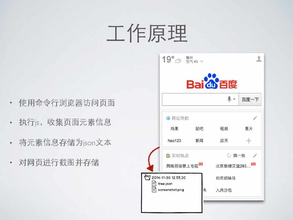 • 使⽤用命令⾏行浏览器访问⻚页⾯面 • 执⾏行js,收集⻚页⾯面元素信息 • 将元素信息存储为json⽂文本 • 对⺴⽹网⻚页进⾏行截图并存储