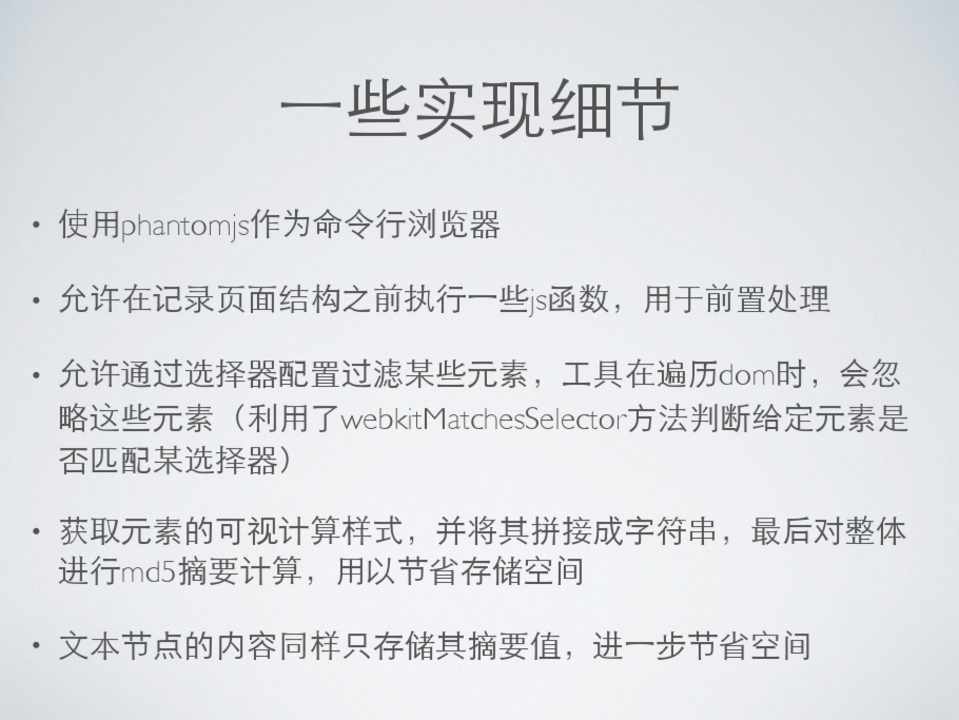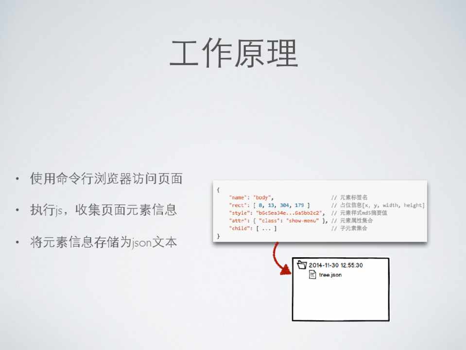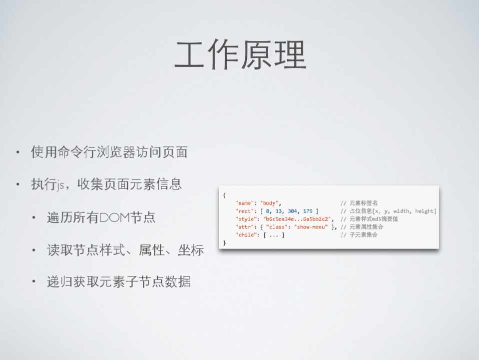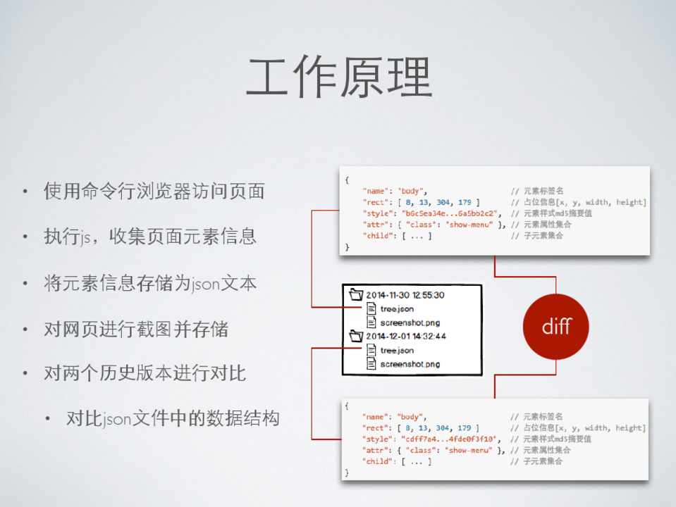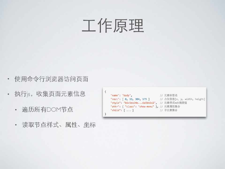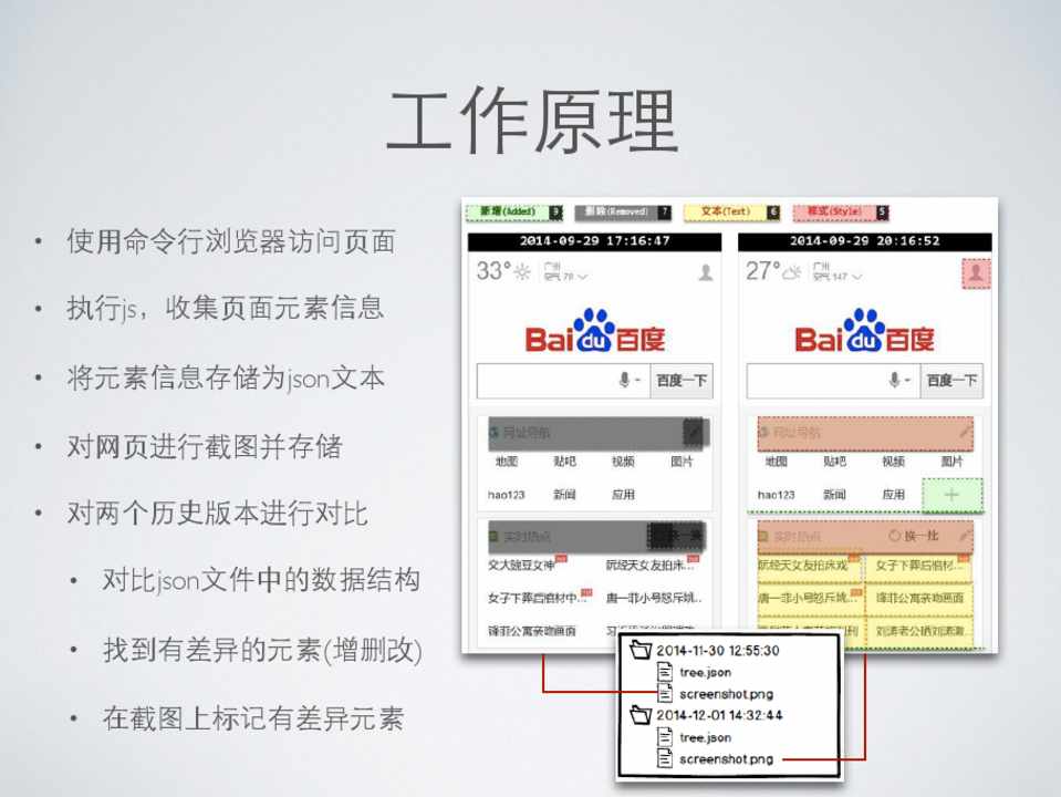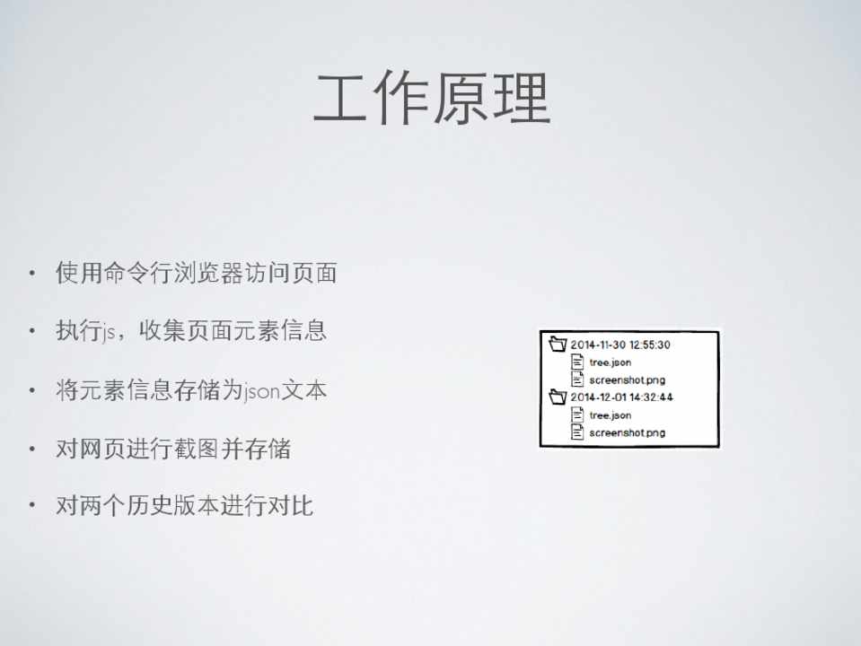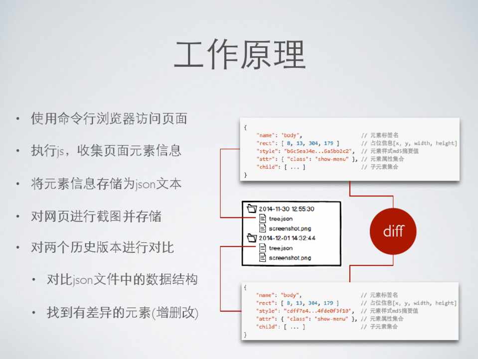 • 使⽤用命令⾏行浏览器访问⻚页⾯面 • 执⾏行js,收集⻚页⾯面元素信息 • 将元素信息存储为json⽂文本 • 对⺴⽹网⻚页进⾏行截图并存储 • 对两个历史版本进⾏行对⽐比