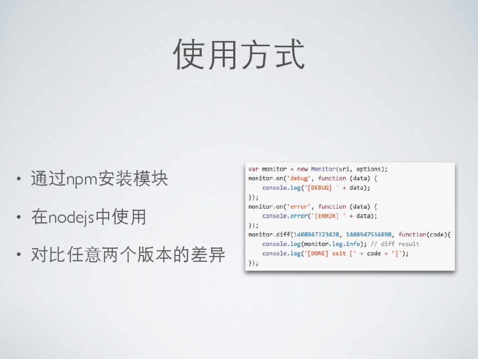 • 通过npm安装模块 • 在nodejs中使⽤用 • 对⽐比任意两个版本的差异