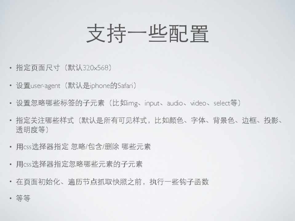 • 指定⻚页⾯面尺⼨寸(默认320x568) • 设置user-agent(默认是iphone的Safari) • 设置忽略哪些标签的⼦子元素(⽐比如img、input、audio、video、select等) • 指定关注哪些样式(默认是所有可⻅见样式,⽐比如颜⾊色、字体、背景⾊色、边框、投影、