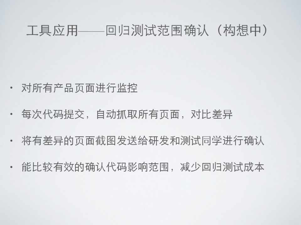• 对所有产品⻚页⾯面进⾏行监控 • 每次代码提交,⾃自动抓取所有⻚页⾯面,对⽐比差异 • 将有差异的⻚页⾯面截图发送给研发和测试同学进⾏行确认 • 能⽐比较有效的确认代码影响范围,减少回归测试成本