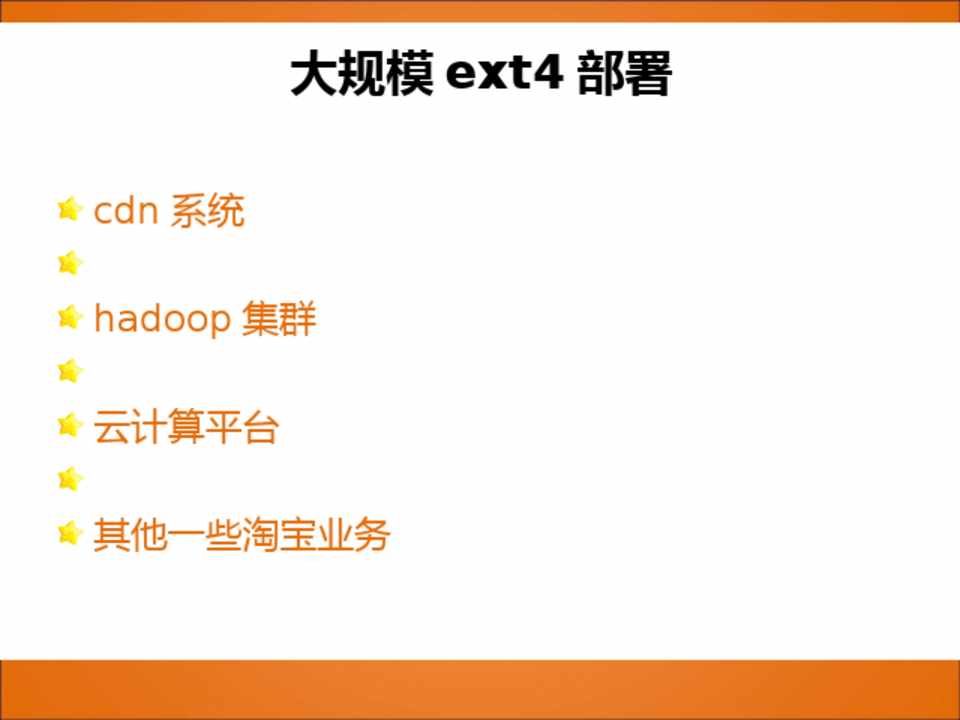 ext2 向 ext4 的数据迁移 ext4 不同特性的选择 针对 hadoop 应用的优化 针对 cdn 系统的优化 针对 ssd 的优化
