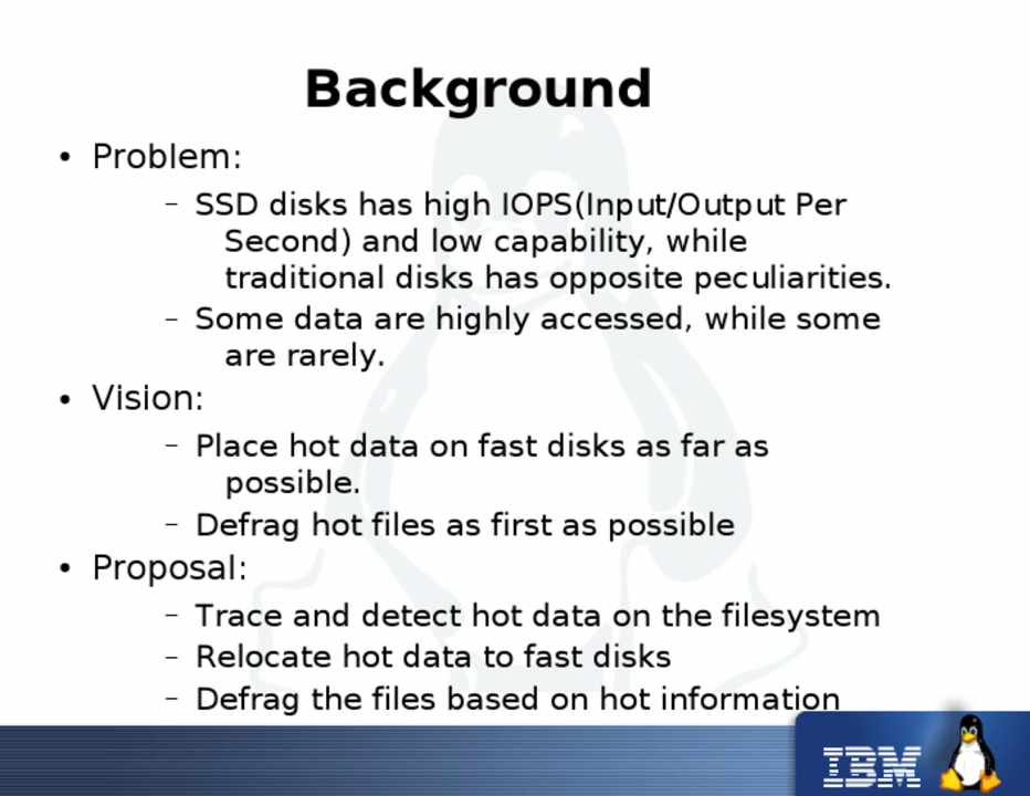 – Trace and detect hot data on the filesystem – Relocate hot data to fast disks – Defrag the files based on hot information