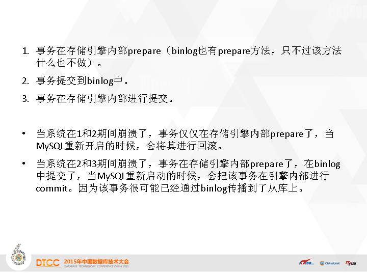 当系统在2和3期间崩溃了,事务在存储引擎内部prepare了,在binlog中提交了,当MySQL重新启动的时候,会把该事务在引擎内部进行commit。因为该事务很可能已经通过binlog传播到了从库上。