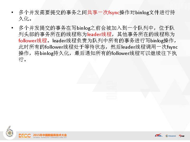 多个并发提交的事务在写binlog之前会被加入到一个队列中,位于队列头部的事务所在的线程称为leader线程,其他事务所在的线程称为follower线程。leader线程负责为队列中所有的事务进行写binlog操作,此时所有的follower线程处于等待状态,然后leader线程调用一次fsync操作,将binlog持久化,最后通知所有的follower线程可以继续往下执行。