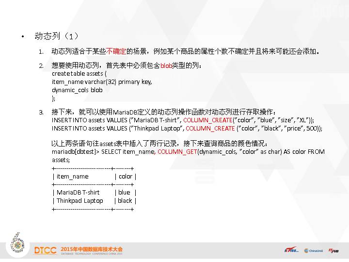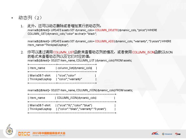 你可以通过调用COLUMN_LIST函数来查看动态列的情况,或者使用COLUMN_JSON函数以JSON的格式来查看动态列以及它们对应的值:mariadb[dbtest]> SELECT item_name, COLUMN_LIST (dynamic_cols) FROM assets;+----------------------------+----------------------------------------+| item_name | column_list(dynamic_cols) |+----------------------------+----------------------------------------+| MariaDB T-shirt | "size","color“ || Thinkpad Laptop | "color","warranty“ |+----------------------------+----------------------------------------+mariadb[dbtest]> SELECT item_name, COLUMN_JSON(dynamic_cols) FROM assets;+----------------------------+-------------------------------------------------------------+| item_name | COLUMN_JSON(dynamic_cols) |+----------------------------+-------------------------------------------------------------+| MariaDB T-shirt | {"size":"XL","color":"blue"} || Thinkpad Laptop | {"color":"black","warranty":"3 years"} |+----------------------------+-------------------------------------------------------------+