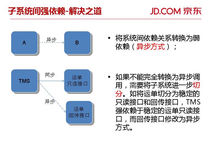 如果不能完全转换为异步调用,需要将子系统进一步切分。如将运单切分为稳定的只读接口和回传接口,TMS强依赖于稳定的运单只读接口,而回传接口修改为异步方式。
