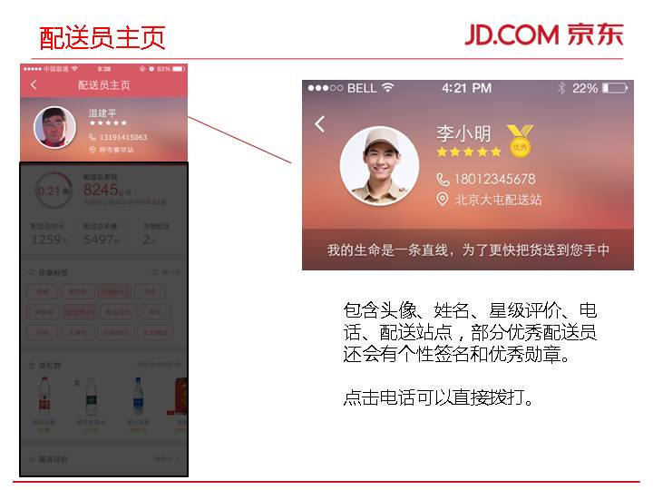 包含头像、姓名、星级评价、电话、配送站点,部分优秀配送员还会有个性签名和优秀勋章。