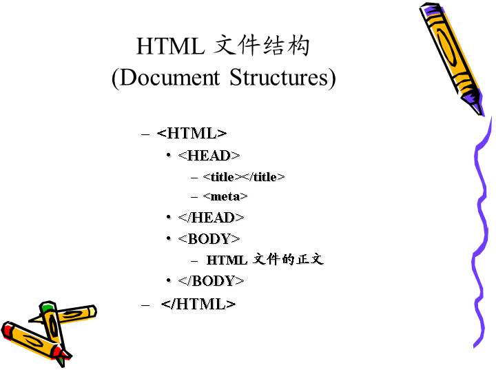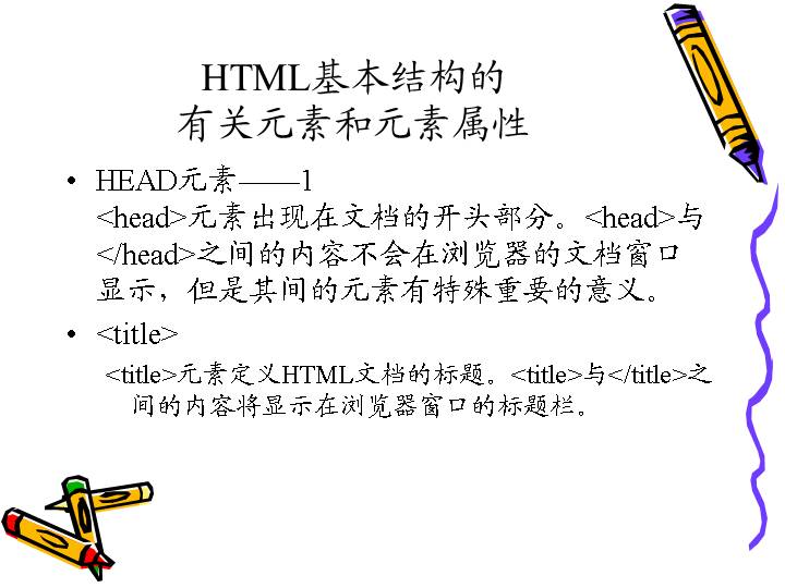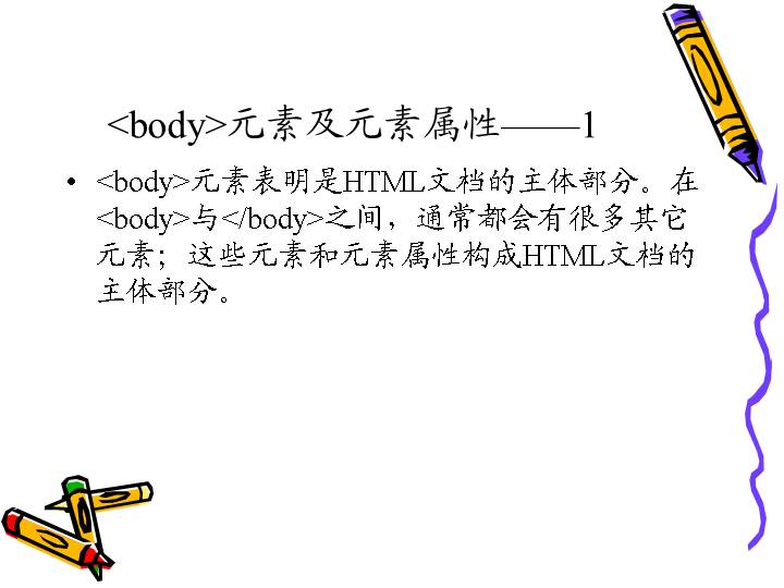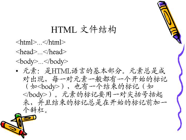 元素:是HTML语言的基本部分。元素总是成对出现,每一对元素一般都有一个开始的标记(如<body>),也有一个结束的标记(如</body>)。元素的标记要用一对尖括号括起来,并且结束的标记总是在开始的标记前加一个斜杠。
