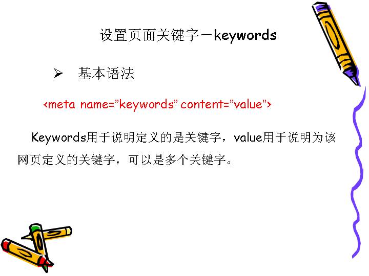 Keywords用于说明定义的是关键字,value用于说明为该网页定义的关键字,可以是多个关键字。