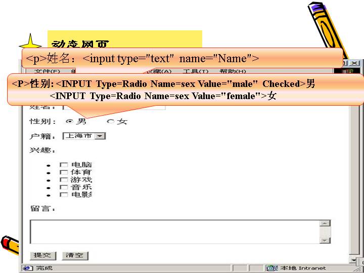 <P>性别: <INPUT Type=Radio Name=sex Value="male" Checked>男