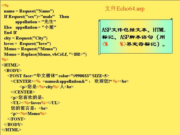 ASP文件包括文本、HTML标记、ASP脚本语句(用<% %>界定符标记)。