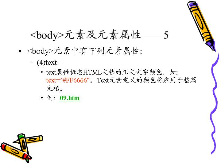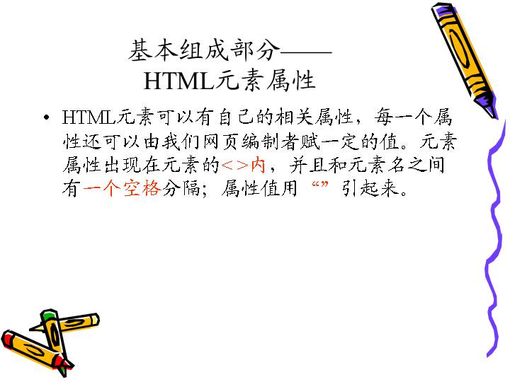 HTML元素可以有自己的相关属性,每一个属性还可以由我们网页编制者赋一定的值。元素属性出现在元素的< >内,并且和元素名之间有一个空格分隔;属性值用“”引起来。