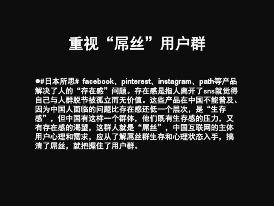#日本所思# facebook、pinterest、instagram、path等产品 解决了人的“存在感”问题。存在感是指人离开了sns就觉得 自己与人群脱节被孤立而无价值。这些产品在中国不能普及、 因为中国人面临的问题比存在感还低一个层次,是“生存 感”,但中国有这样一个群体,他们既有生存感的压力,又 有存在感的渴望,这群人就是“屌丝”,中国互联网的主体 用户心理和需求,应从了解屌丝群生存和心理状态入手,搞 清了屌丝,就把握住了用户群。