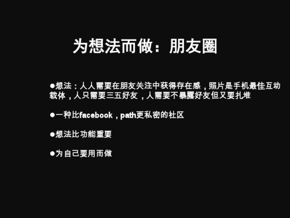 想法:人人需要在朋友关注中获得存在感,照片是手机最佳互动 载体,人只需要三五好友,人需要不暴露好友但又要扎堆