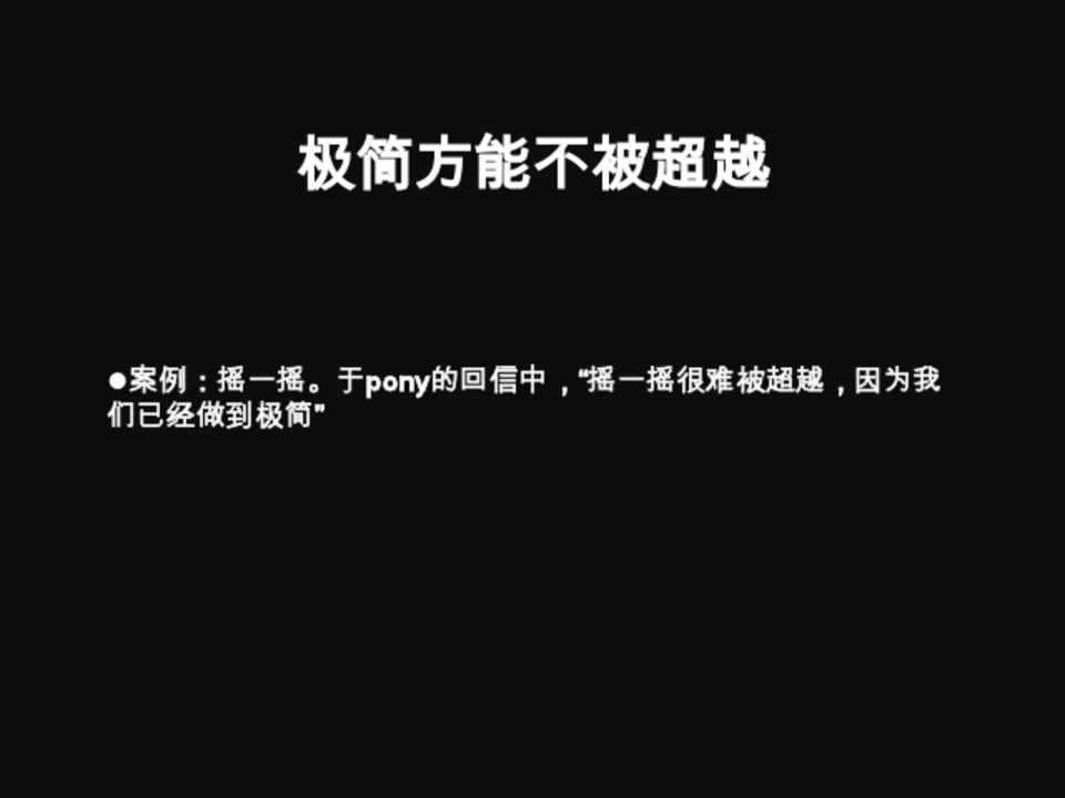 案例:摇一摇。于pony的回信中,“摇一摇很难被超越,因为我 们已经做到极简”