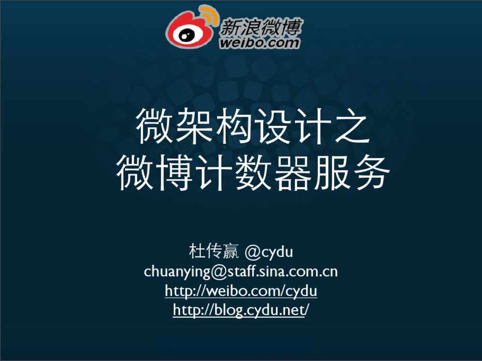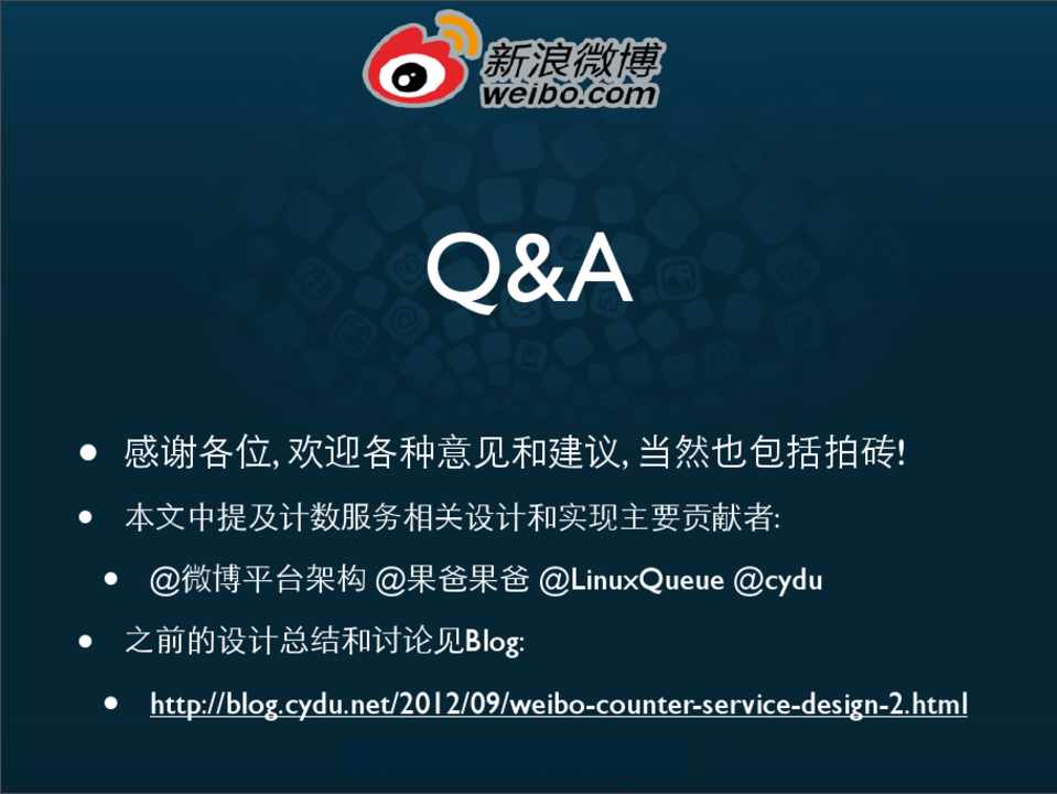 • 本文中提及计数服务相关设计和实现主要贡献者: • @微博平台架构 @果爸果爸 @LinuxQueue @cydu • 之前的设计总结和讨论见Blog: • http://blog.cydu.net/2012/09/weibo-counter-service-design-2.html