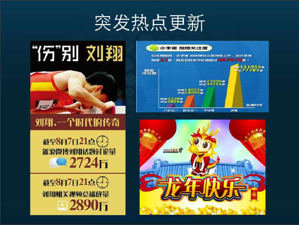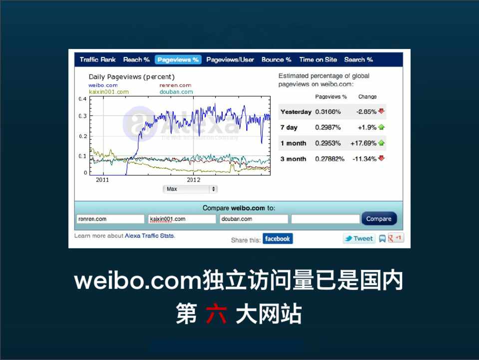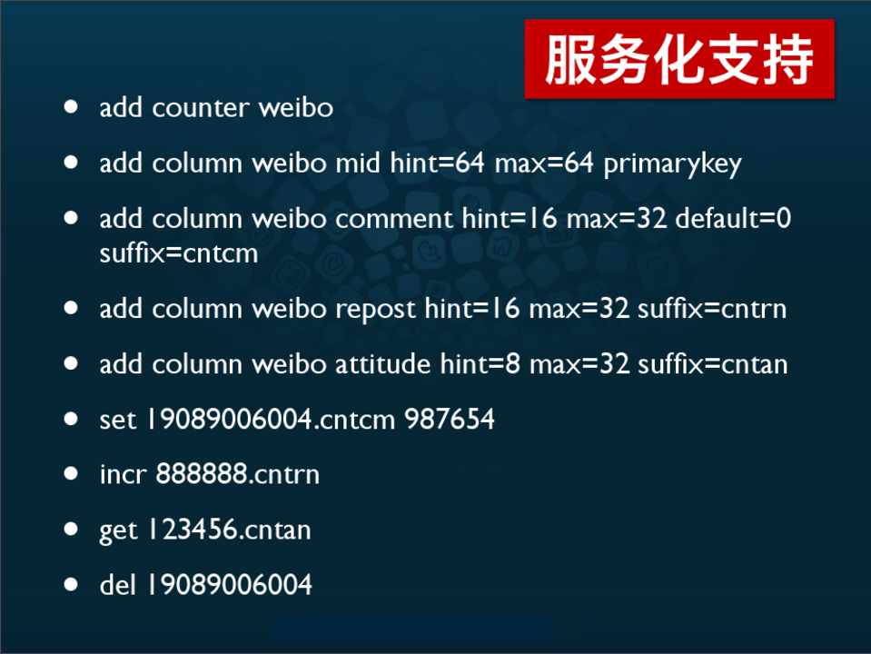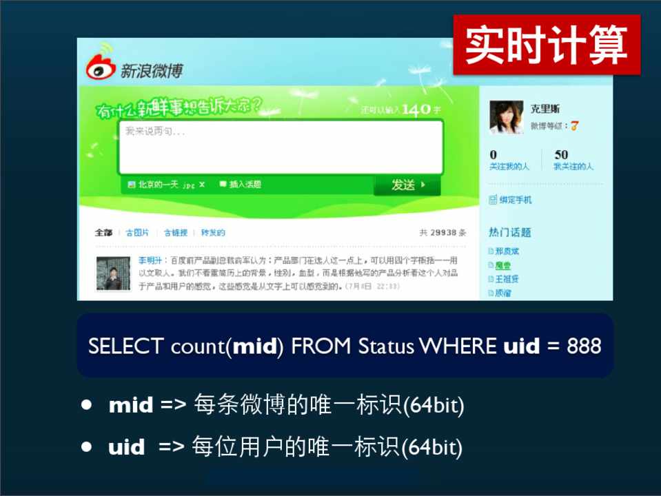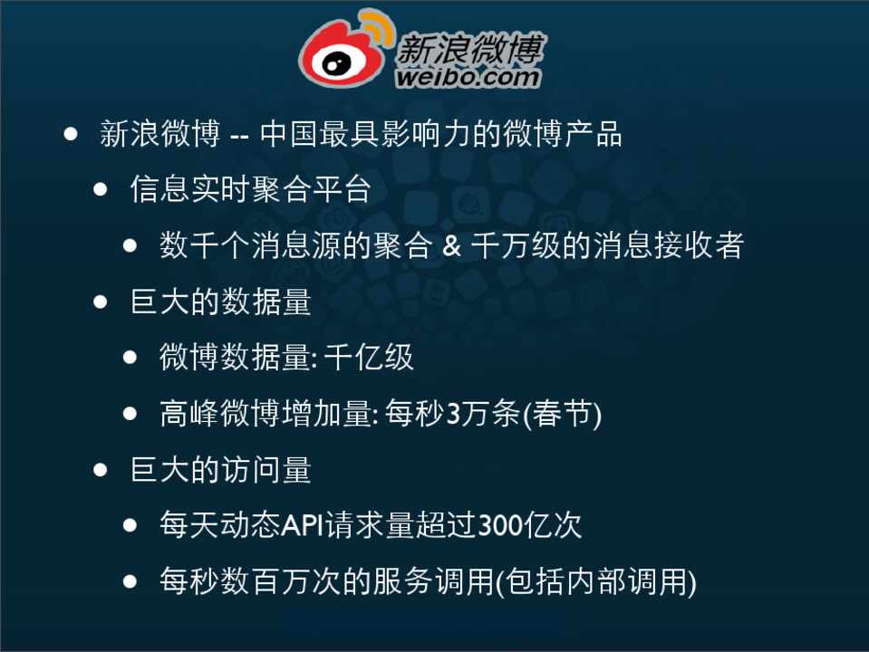 • 新浪微博 -- 中国最具影响力的微博产品 • 信息实时聚合平台 • 数千个消息源的聚合 & 千万级的消息接收者 • 巨大的数据量 • 微博数据量: 千亿级 • 高峰微博增加量: 每秒3万条(春节) • 巨大的访问量 • 每天动态API请求量超过300亿次 • 每秒数百万次的服务调用(包括内部调用)