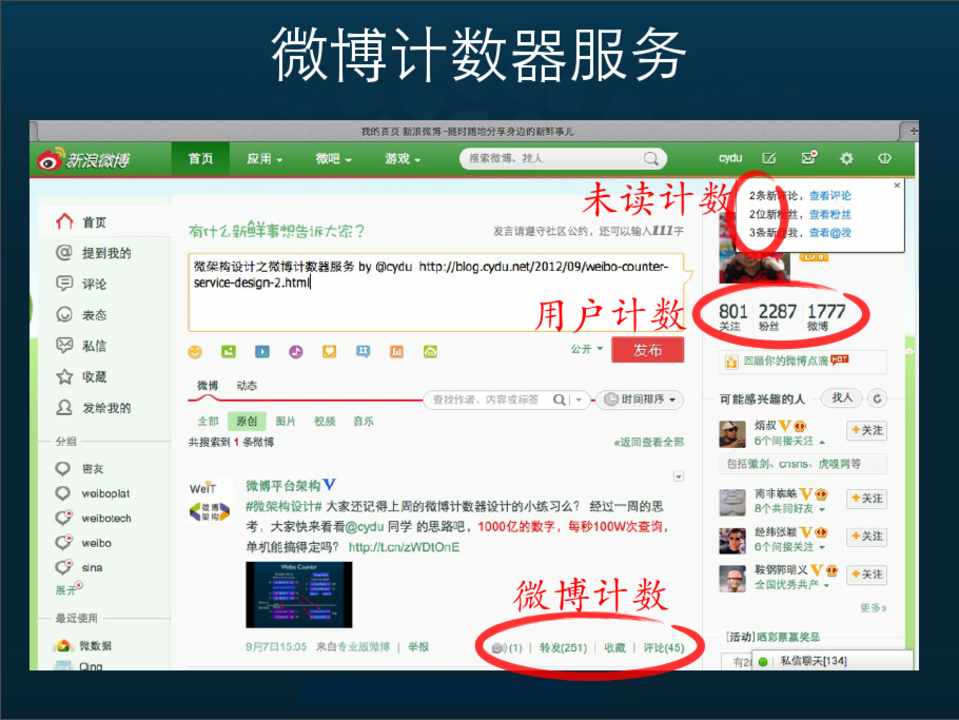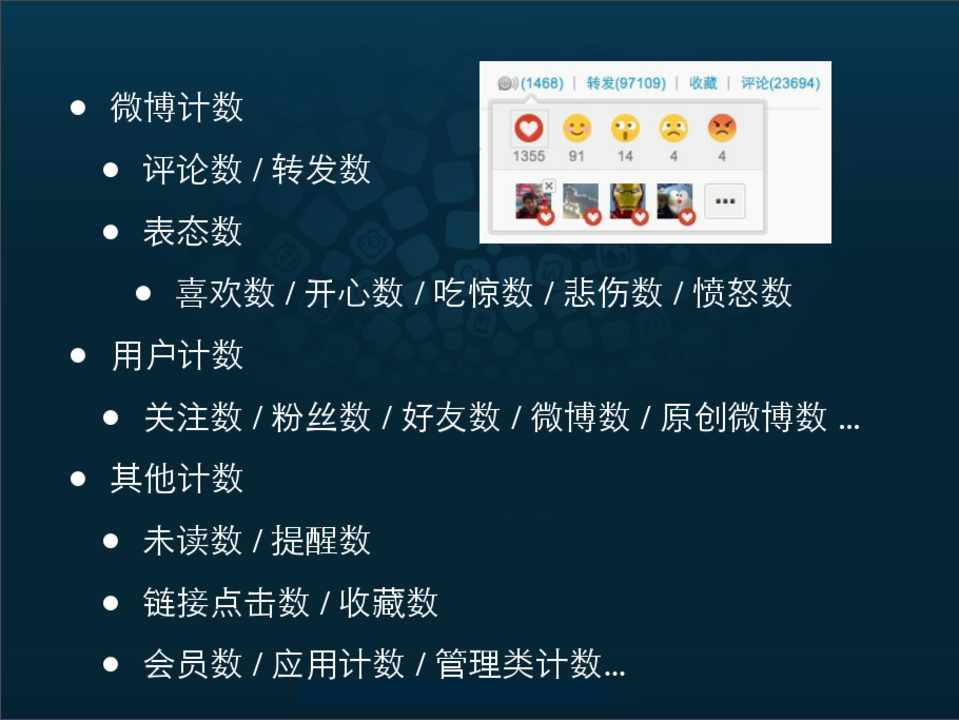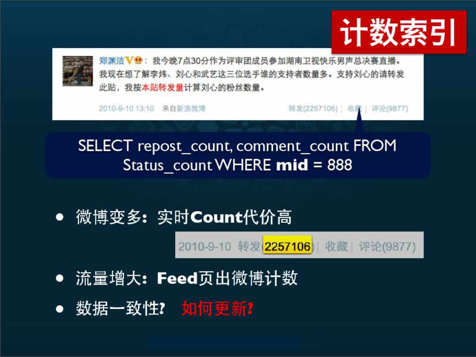 • 微博变多: 实时Count代价高 • 流量增大: Feed页出微博计数 • 数据⼀一致性? 如何更新?