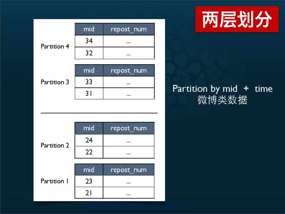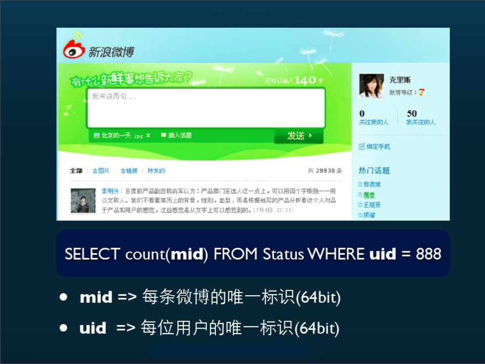 • mid => 每条微博的唯⼀一标识(64bit) • uid => 每位用户的唯⼀一标识(64bit)