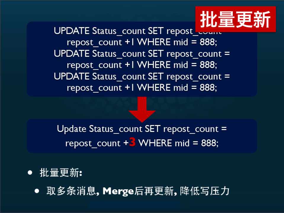 • 批量更新: • 取多条消息, Merge后再更新, 降低写压力