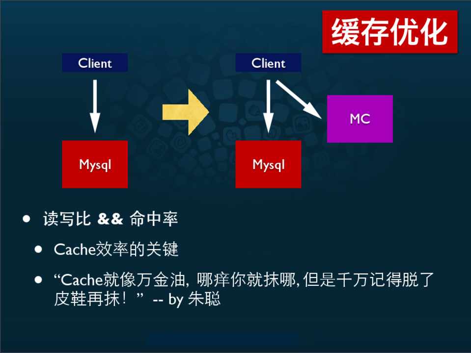 • 读写比 && 命中率 • Cache效率的关键 • “Cache就像万金油, 哪痒你就抹哪, 但是千万记得脱了