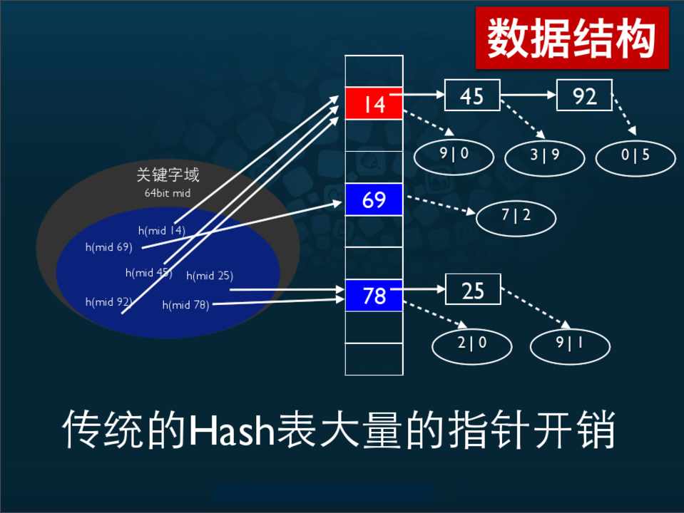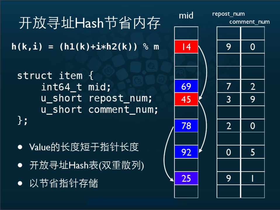 • Value的长度短于指针长度 • 开放寻址Hash表(双重散列) • 以节省指针存储