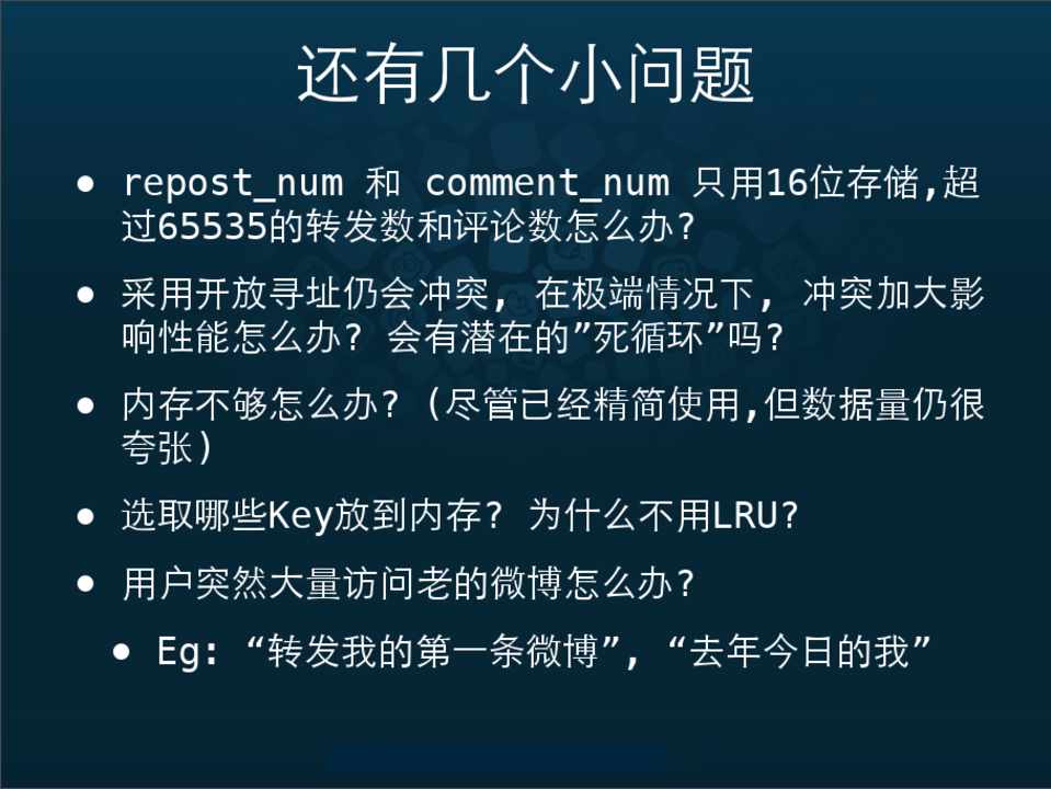 • 选取哪些Key放到内存? 为什么不用LRU? • 用户突然大量访问老的微博怎么办?