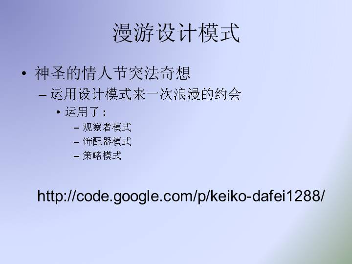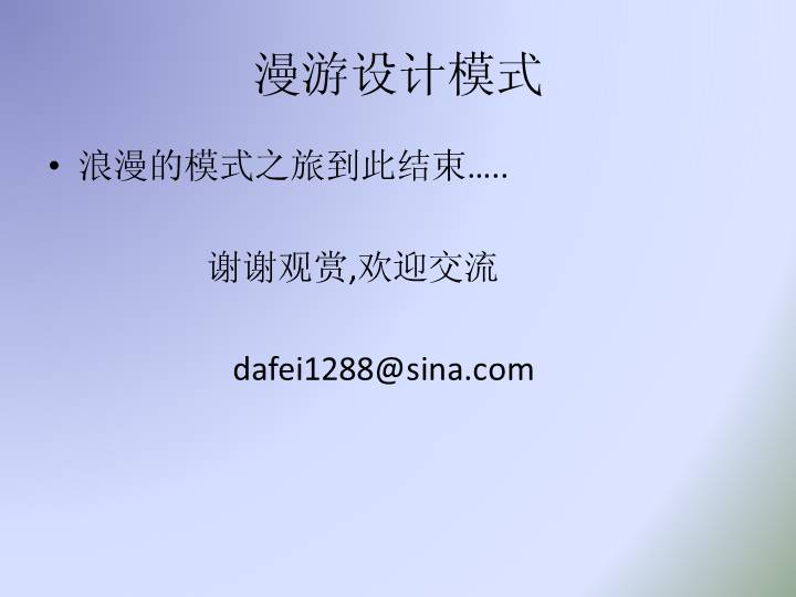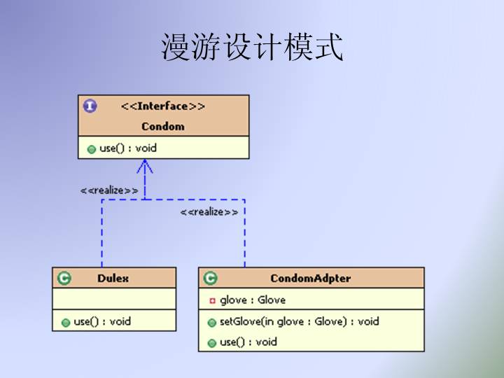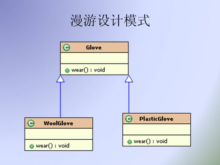 3.依赖倒置原则(Dependence Inversion Principle),要求客户端依赖于抽象耦合.(1)表述:抽象不应当依赖于细节,细节应当依赖于抽象.(Program to an interface, not an implementaction)(2)表述二:针对接口编程的意思是说,应当使用接口和抽象类进行变量的类型声明,参量的类型声明,方法的返还类型声明,以及数据类型的转换等.不要针对实现编程的意思就是说,不应当使用具体类进行变量的类型声明,参量类型声明,方法的返还类型声明,以及数据类型的转换等. 要保证做到这一点,一个具体的类应等只实现接口和抽象类中声明过的方法,而不应当给出多余的方法. 只要一个被引用的对象存在抽象类型,就应当在任何引用此对象的地方使用抽象类型,包括参量的类型声明,方法返还类型的声明,属性变量的类型声明等.(3)接口与抽象的区别就在于抽象类可以提供某些方法的部分实现,而接口则不可以,这也大概是抽象类唯一的优点.如果向一个抽象类加入一个新的具体方法,那么所有的子类型一下子就都得到得到了这个新的具体方法,而接口做不到这一点.如果向一个接口加入了一个新的方法的话,所有实现这个接口的类就全部不能通过编译了,因为它们都没有实现这个新声明的方法.这显然是接口的一个缺点.(4)一个抽象类的实现只能由这个抽象类的子类给出,也就是说,这个实现处在抽象类所定义出的继承的登记结构中,而由于一般语言都限制一个类只能从最多一个超类继承,因此将抽象作为类型定义工具的效能大打折扣. 反过来,看接口,就会发现任何一个实现了一个接口所规定的方法的类都可以具有这个接口的类型,而一个类可以实现任意多个接口.(5)从代码重构的角度上讲,将一个单独的具体类重构成一个接口的实现是很容易的,只需要声明一个接口,并将重要的方法添加到接口声明中,然后在具体类定义语句中加上保留字以继承于该接口就行了. 而作为一个已有的具体类添加一个抽象类作为抽象类型不那么容易,因为这个具体类有可能已经有一个超类.这样一来,这个新定义的抽象类只好继续向上移动,变成这个超类的超类,如此循环,最后这个新的抽象类必定处于整个类型等级结构的最上端,从而使登记结构中的所有成员都会受到影响.(6)接口是定义混合类型的理想工具,所为混合类型,就是在一个类的主类型之外的次要类型.一个混合类型表明一个类不仅仅具有某个主类型的行为,而且具有其他的次要行为.(7)联合使用接口和抽象类: 由于抽象类具有提供缺省实现的优点,而接口具有其他所有优点,所以联合使用两者就是一个很好的选择. 首先,声明类型的工作仍然接口承担的,但是同时给出的还有一个抽象类,为这个接口给出一个缺省实现.其他同属于这个抽象类型的具体类可以选择实现这个接口,也可以选择继承自这个抽象类.如果一个具体类直接实现这个接口的话,它就必须自行实现所有的接口;相反,如果它继承自抽象类的话,它可以省去一些不必要的的方法,因为它可以从抽象类中自动得到这些方法的缺省实现;如果需要向接口加入一个新的方法的话,那么只要同时向这个抽象类加入这个方法的一个具体实现就可以了,因为所有继承自这个抽象类的子类都会从这个抽象类得到这个具体方法.这其实就是缺省适配器模式(Defaule Adapter).(8)什么是高层策略呢?它是应用背后的抽象,是那些不随具体细节的改变而改变的真理. 它是系统内部的系统____隐喻.