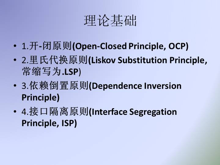 1.开-闭原则(Open-Closed Principle, OCP):一个软件实体应当对扩展开发,对修改关闭.说的是,再设计一个模块的时候,应当使这个模块可以在不被修改的前提下被扩展.换言之,应当可以在不必修改源代码的情况下改变这个模块的行为,在保持系统一定稳定性的基础上,对系统进行扩展。这是面向对象设计(OOD)的基石,也是最重要的原则。