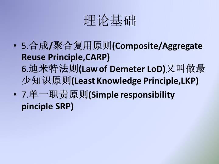 5.合成/聚合复用原则(Composite/Aggregate Reuse Principle,CARP)6.迪米特法则(Law of Demeter LoD)又叫做最少知识原则(Least Knowledge Principle,LKP)
