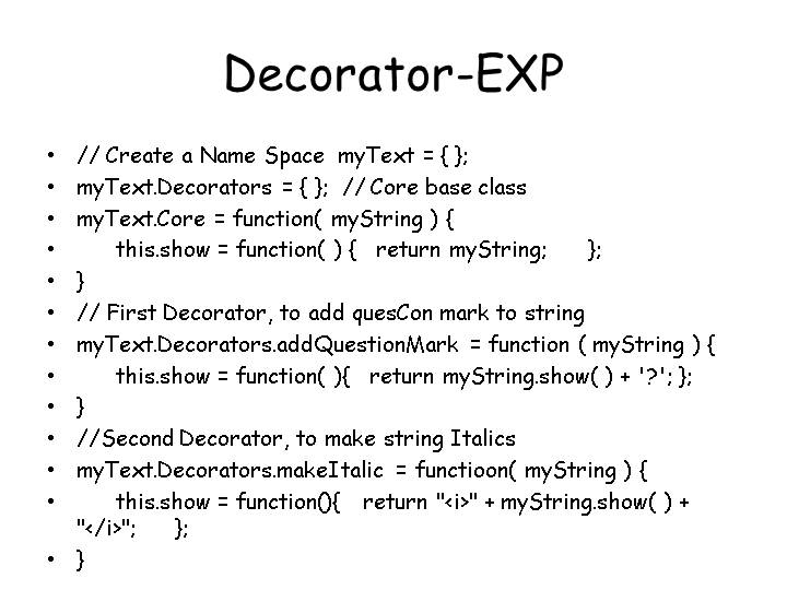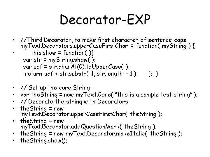 //Third Decorator, to make first character of sentence caps  myText.Decorators.upperCaseFirstChar = function( myString ) {