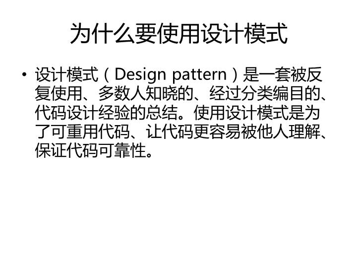 设计模式(Design pattern)是一套被反复使用、多数人知晓的、经过分类编目的、代码设计经验的总结。使用设计模式是为了可重用代码、让代码更容易被他人理解、保证代码可靠性。