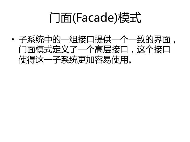 子系统中的一组接口提供一个一致的界面, 门面模式定义了一个高层接口,这个接口使得这一子系统更加容易使用。