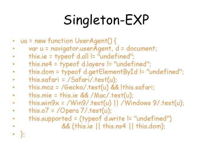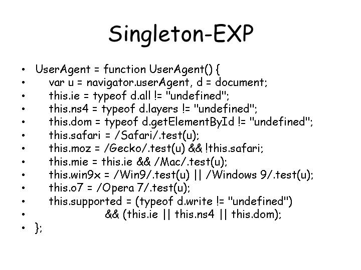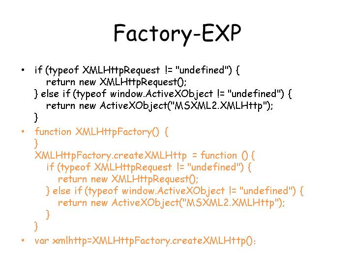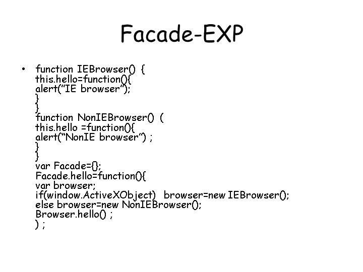 function IEBrowser(){this.hello=function(){alert(”IE browser”);}}function NonIEBrowser()(this.hello =function(){alert(“NonIE browser”);}}var Facade={};Facade.hello=function(){var browser;if(window.ActiveXObject)browser=new IEBrowser();else browser=new NonIEBrowser();Browser.hello(););