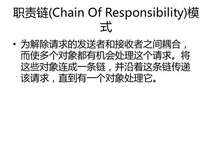 为解除请求的发送者和接收者之间耦合,而使多个对象都有机会处理这个请求。将这些对象连成一条链,并沿着这条链传递该请求,直到有一个对象处理它。