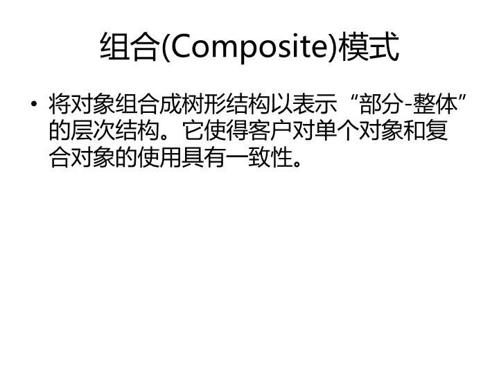 将对象组合成树形结构以表示“部分-整体”的层次结构。它使得客户对单个对象和复合对象的使用具有一致性。