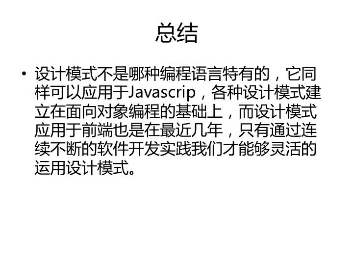 设计模式不是哪种编程语言特有的,它同样可以应用于Javascrip,各种设计模式建立在面向对象编程的基础上,而设计模式应用于前端也是在最近几年,只有通过连续不断的软件开发实践我们才能够灵活的运用设计模式。