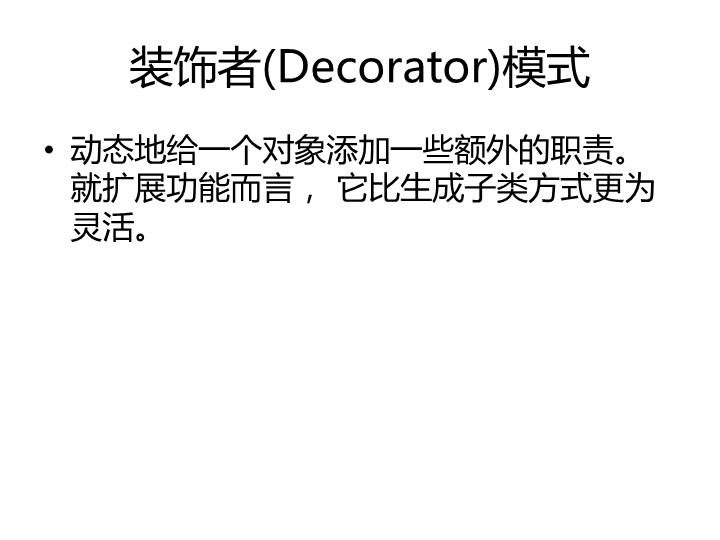动态地给一个对象添加一些额外的职责。就扩展功能而言, 它比生成子类方式更为灵活。