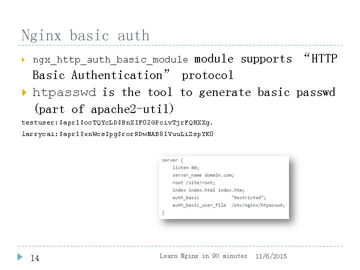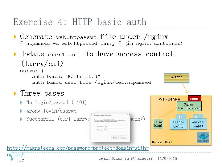 Generate web.htpasswd file under /nginx# htpasswd -c web.htpasswd larry # (in nginx container)