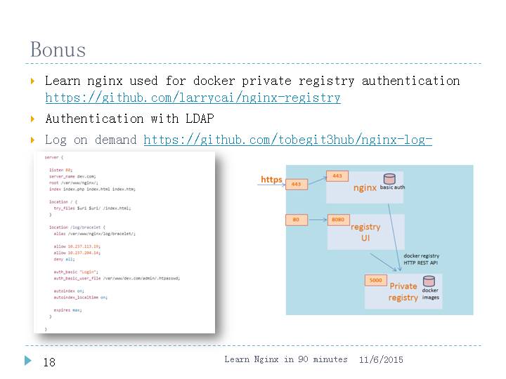 Learn nginx used for docker private registry authentication https://github.com/larrycai/nginx-registry
